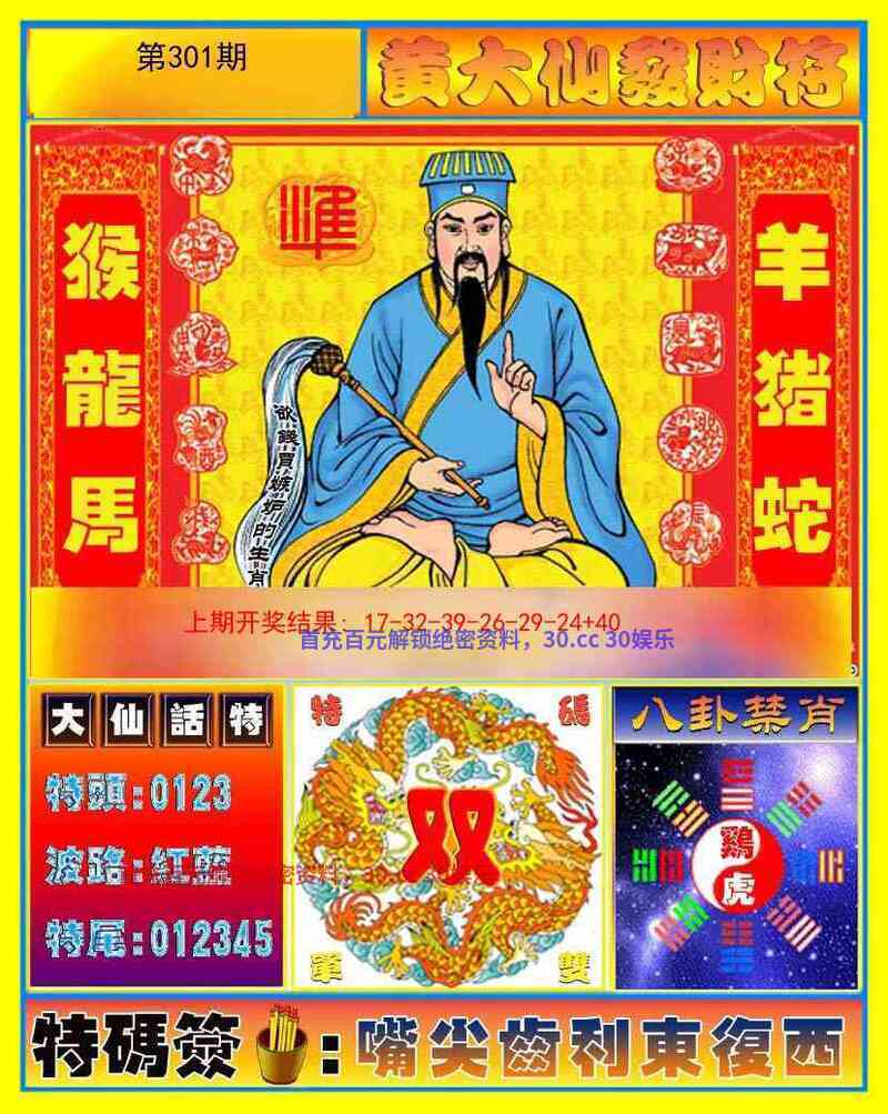 302期:黄大仙心水/简单好下注/台湾玄机诗/港台澳七肖/必中人物